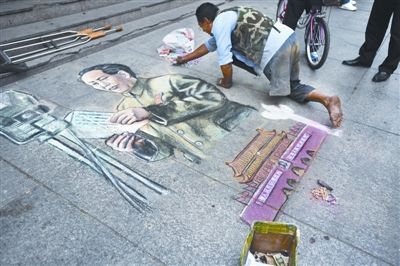 一位路过的外国老人拿着DV,呆了十来分钟,从各个角度拍下从兰桂和他的画。他告诉记者,自己叫Arne Winness,来自挪威,马上要娶一位中国新娘。他一眼认出从兰桂画的是毛泽东,也知道马上是新中国的国庆,他反复告诉记者,“画很有意义,这位艺术家很棒”。